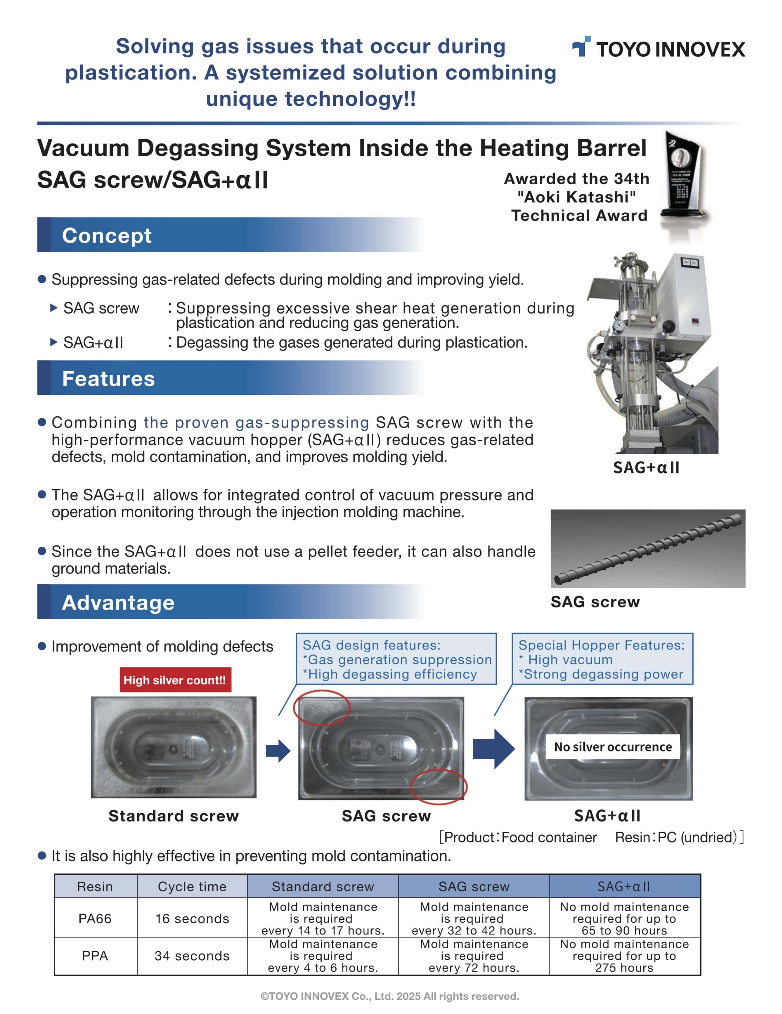 "Vacuum Degassing System inside the Heating Barrel, implemented in the SAG screw and SAGα, won the "Aoki Katashi Technology Award."