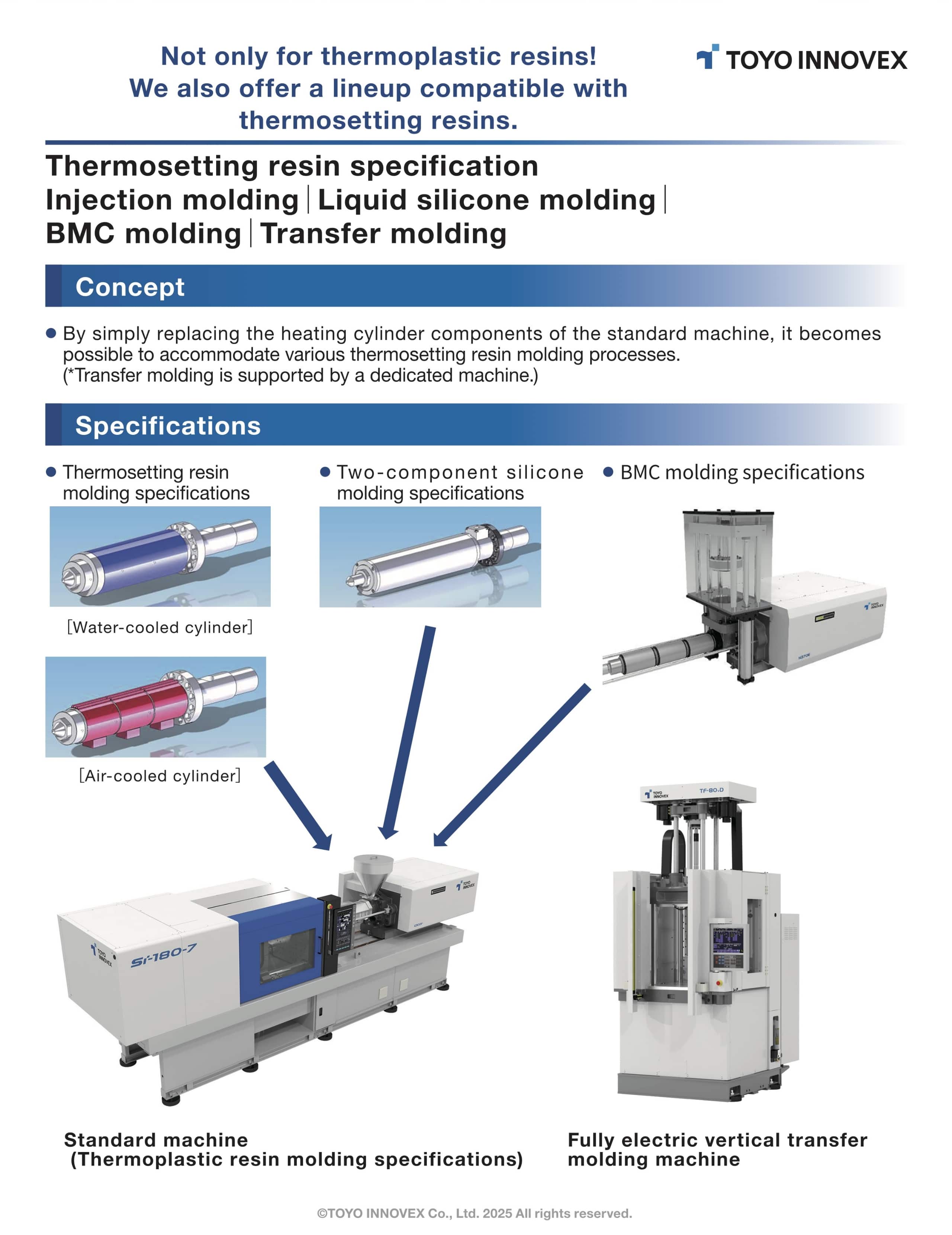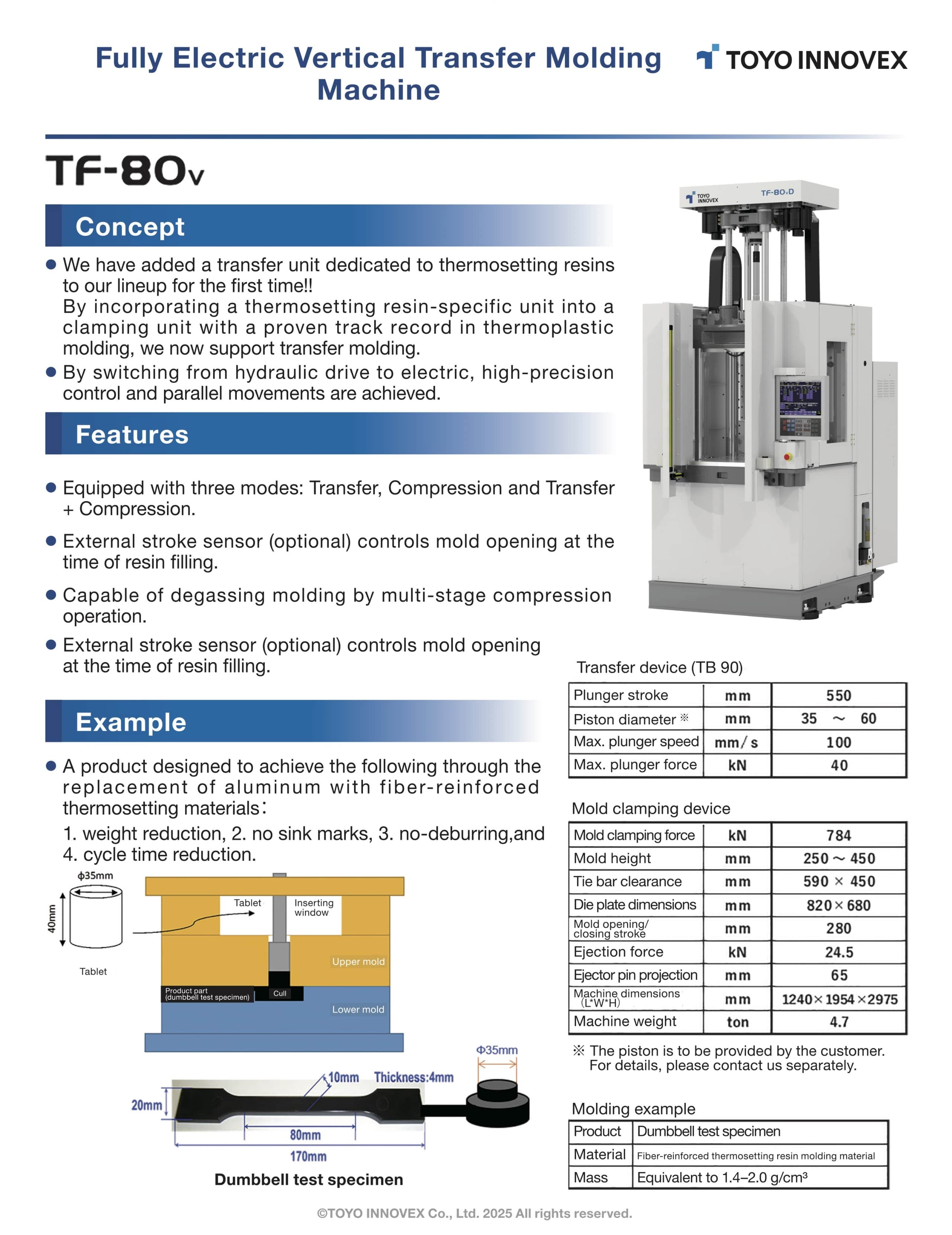 Injection molding|Liquid silicone molding|BMC molding|Transfer molding" Fully electric vertical transfer molding machine TF-80v Resin viscosity automatic adjustment program meltcon® Servo unscrewing system Molding with biomass materials T-Station lite Ver.2.0(Optional) T-Remote WEB(Optional)