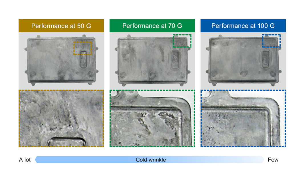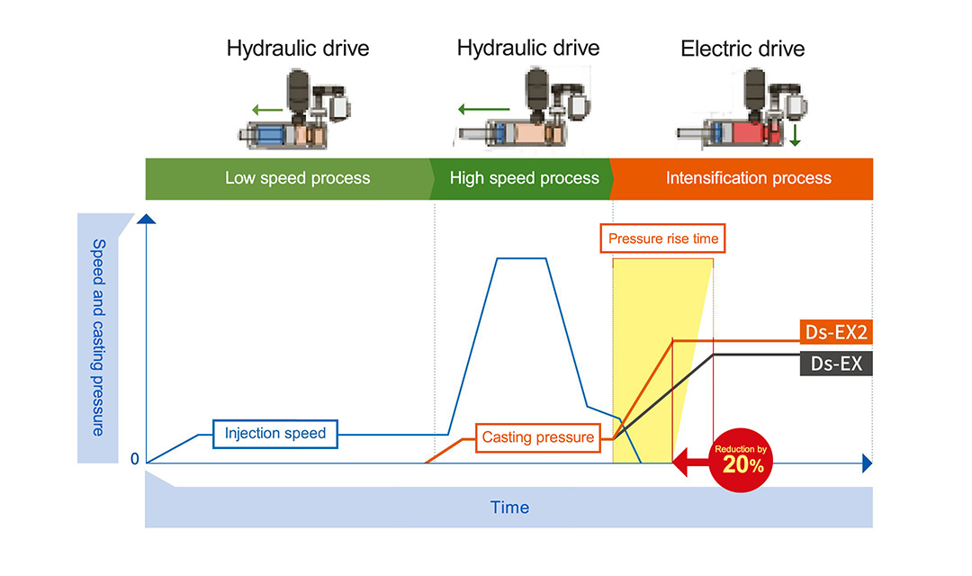 By reducing the weight of the electric drive unit and optimizing its control, intensification performance has been improved. This allows pressure to be applied before the molten metal solidifies, resulting in smaller porosity.