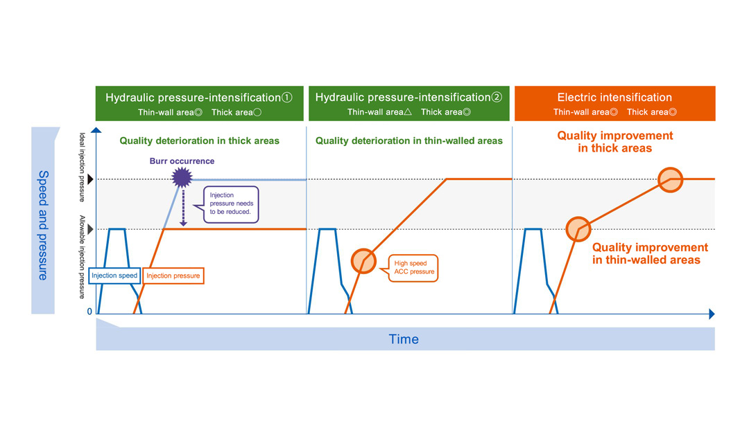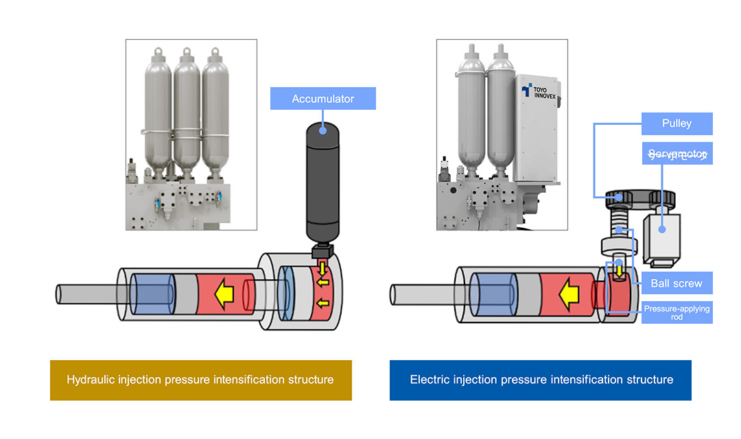 In the hydraulic system, intensification is made by moving the pressure-applying piston using pressurized oil stored in an accumulator. In contrast, electric intensification system operates by moving the pressure-applying rod with a servomotor. Servo motor-driven control enables pressure compensation and multi-stage intensification.