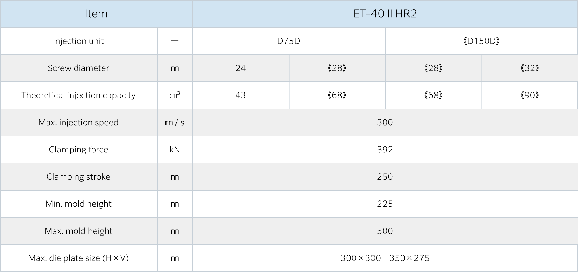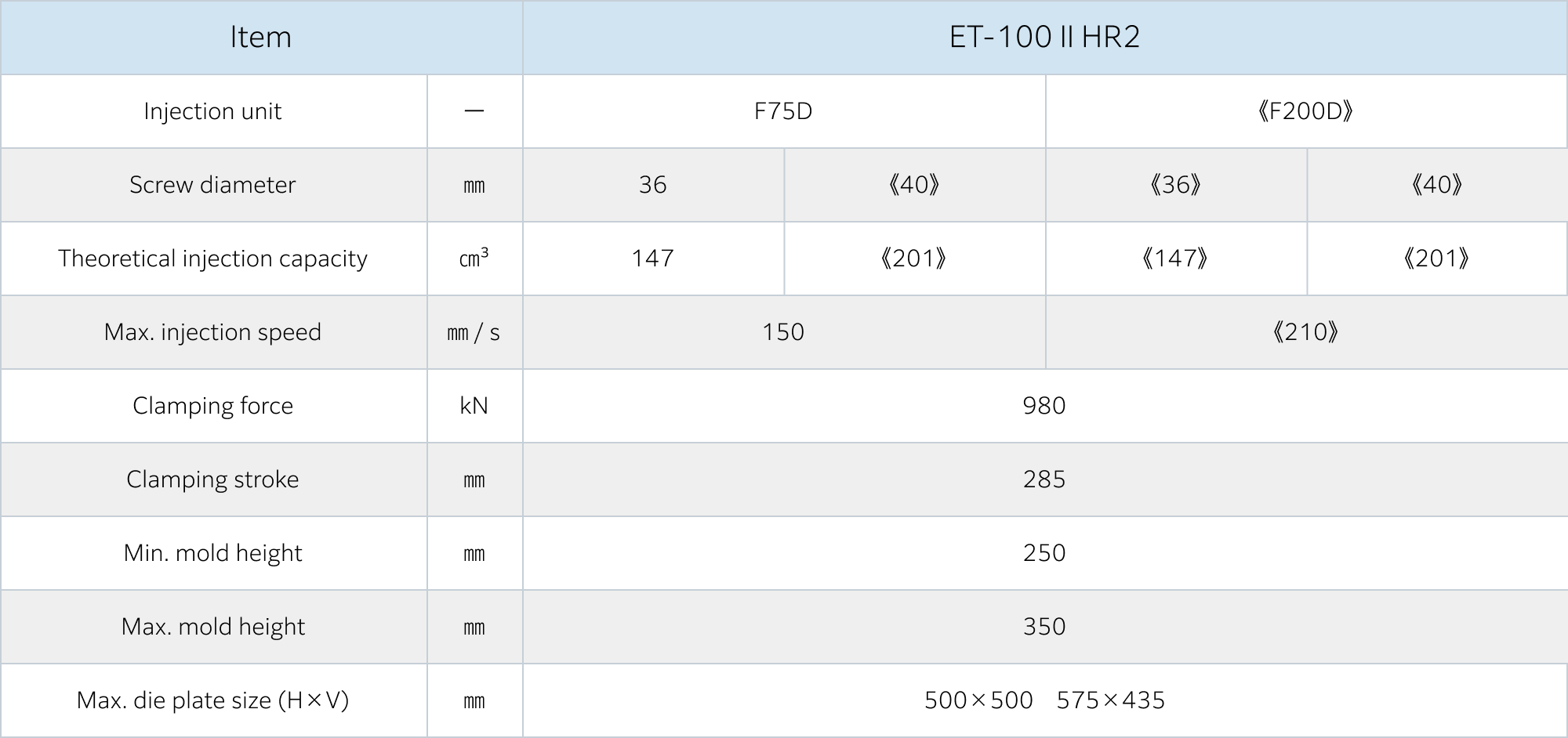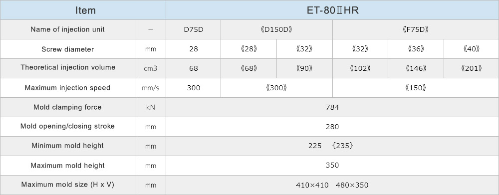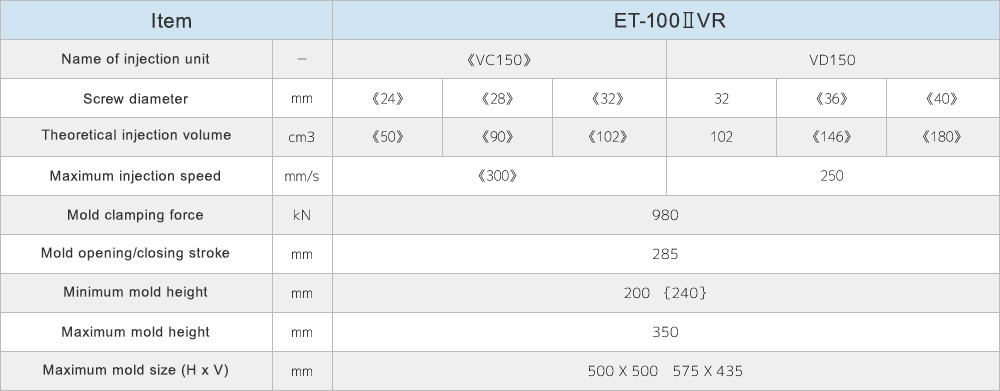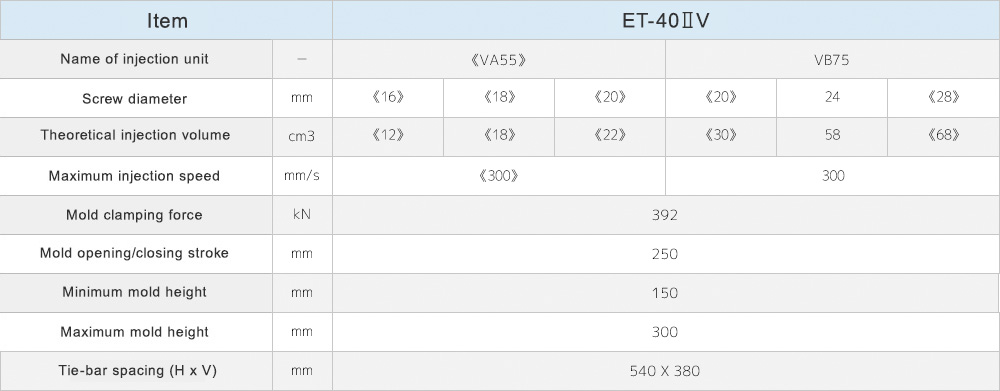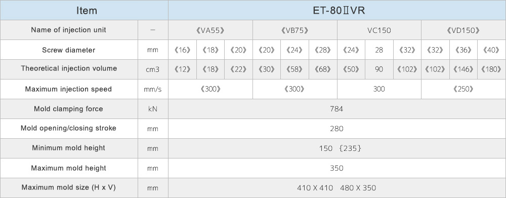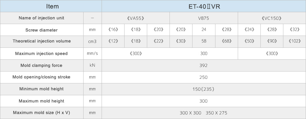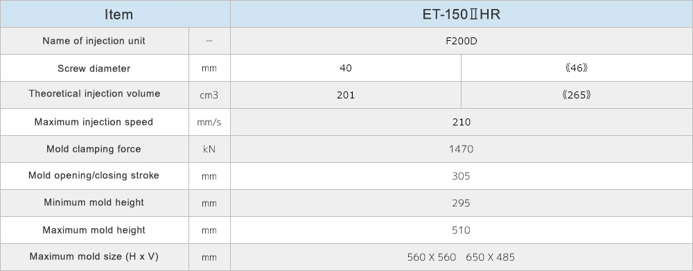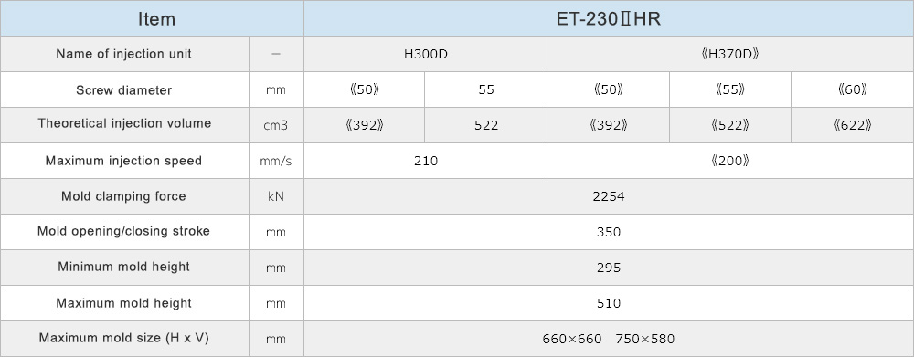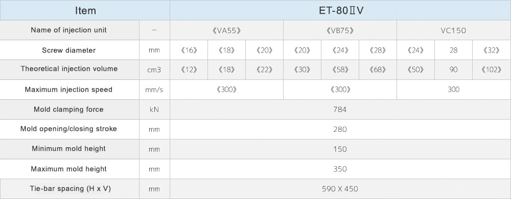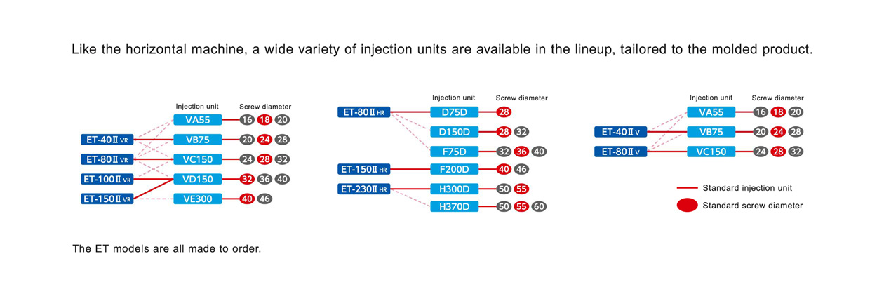 A wide lineup and variety of injection units, ranging from 40 tons to 230 tons of clamping force.