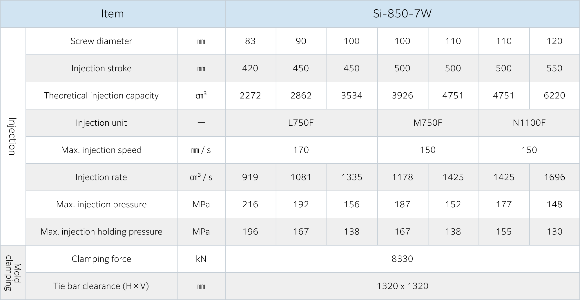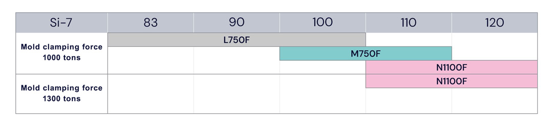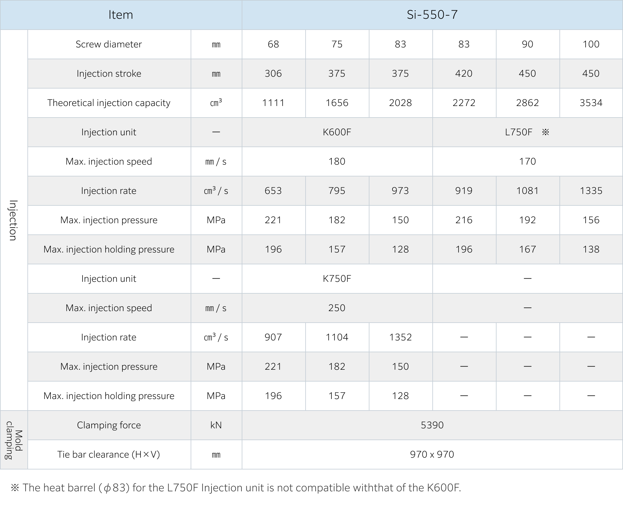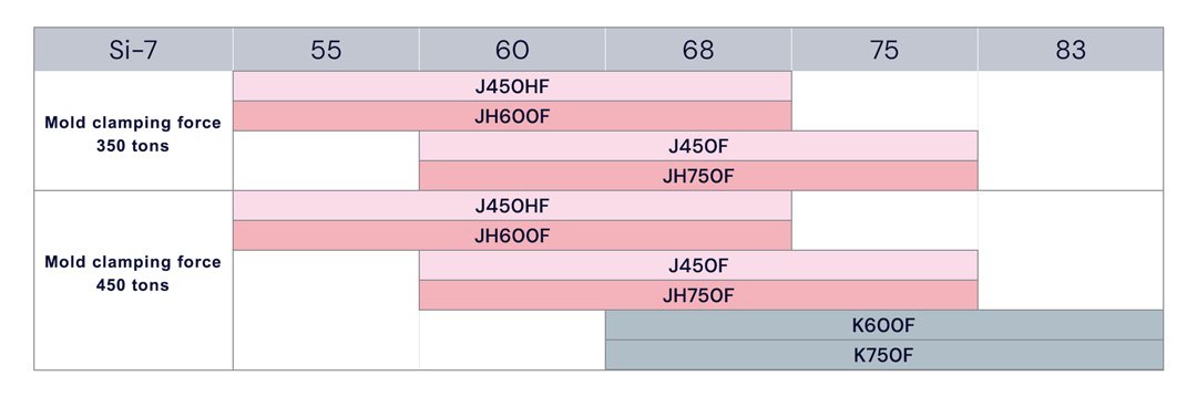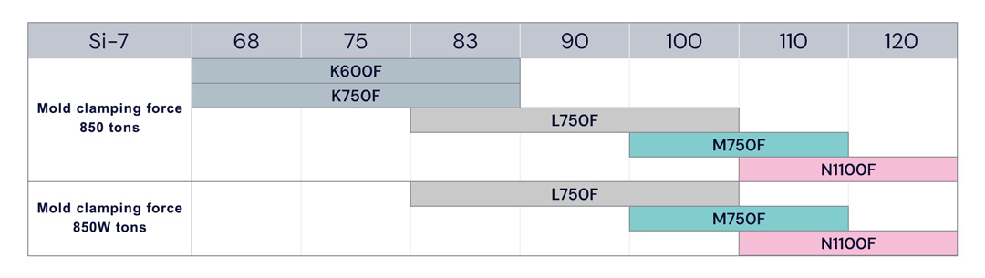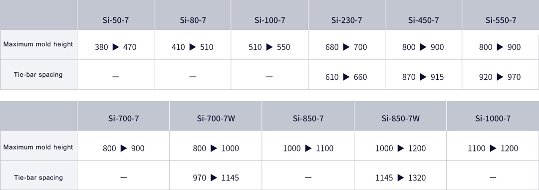 By expanding the daylight and increasing the tie-bar spacing, the flexibility for mounting molds has been enhanced. The increased space also provides more room for considering mold changeover devices, contributing to improved production efficiency.