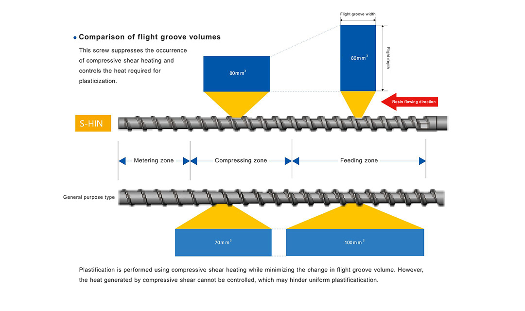 The S-HIN screw is developed as a more versatile screw based on the performance of the SAG screw. We have improved plasticizing capability to accommodate a wider range of resins while suppressing breakup, an instability phenomenon during plasticization, and achieving plasticization stability.