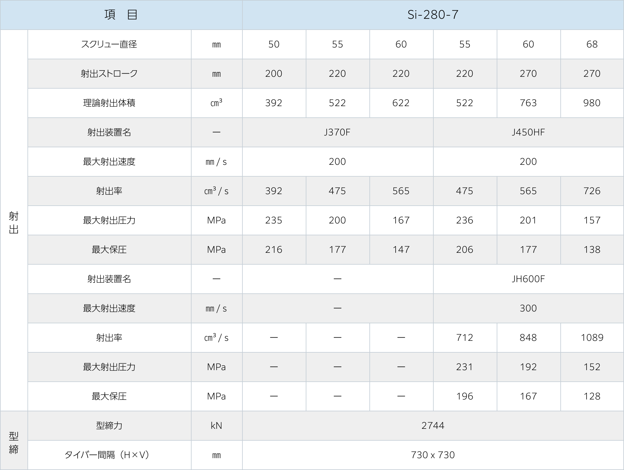 • 最大射出速度の数値は計算値です。射出圧力の設定値によって制限される場合があります。