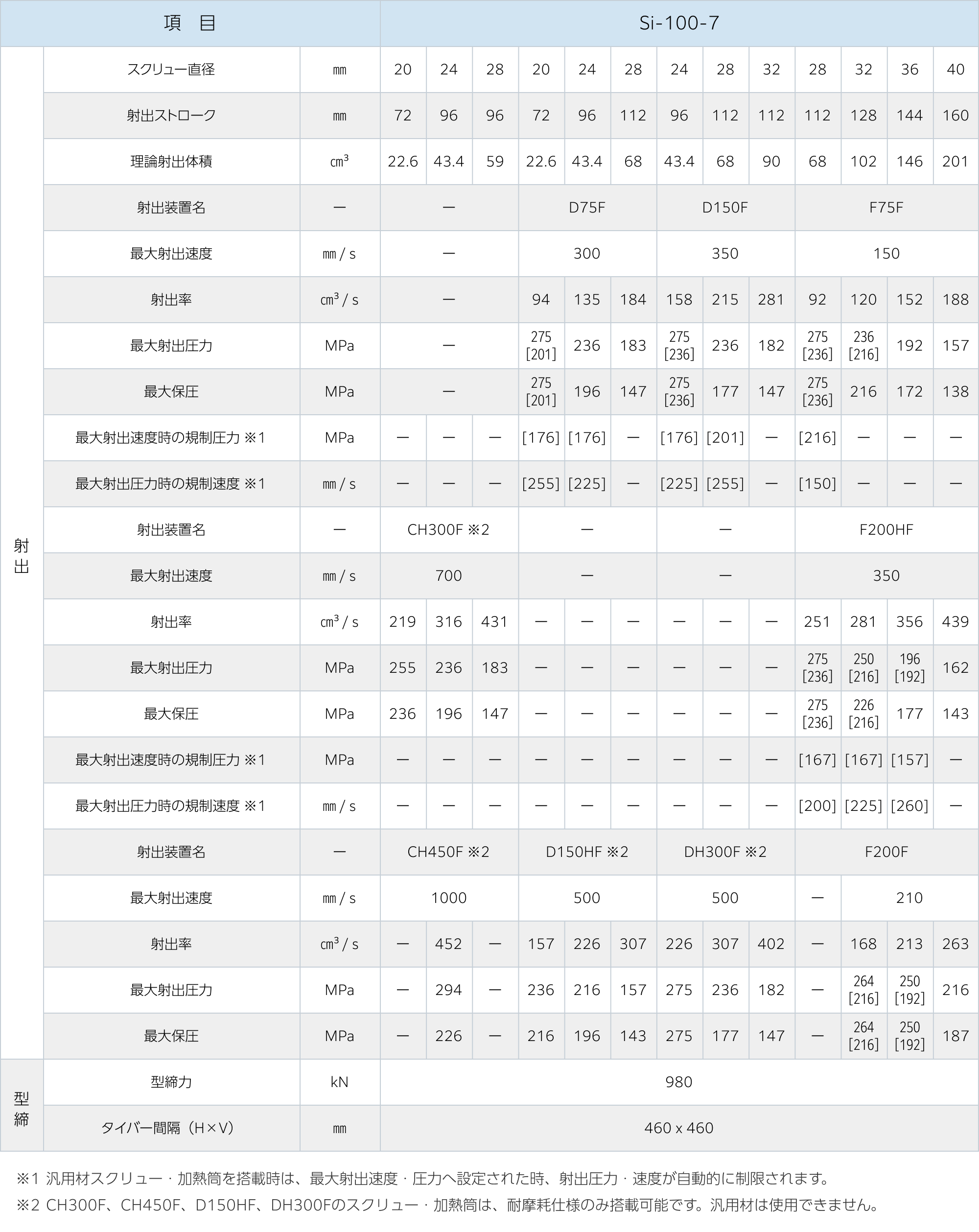 - 最大射出速度の数値は計算値です。射出圧力の設定値によって制限される場合があります。