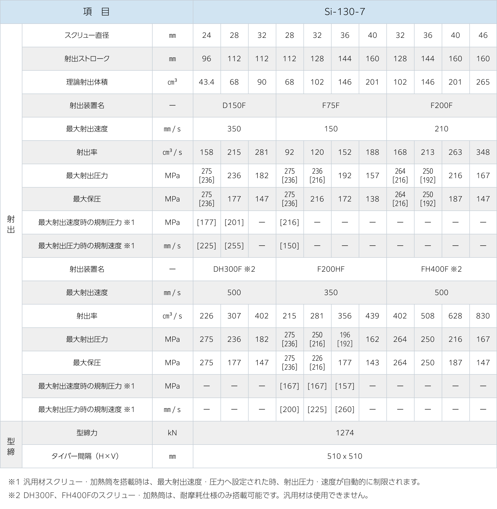 - 最大射出速度の数値は計算値です。射出圧力の設定値によって制限される場合があります。