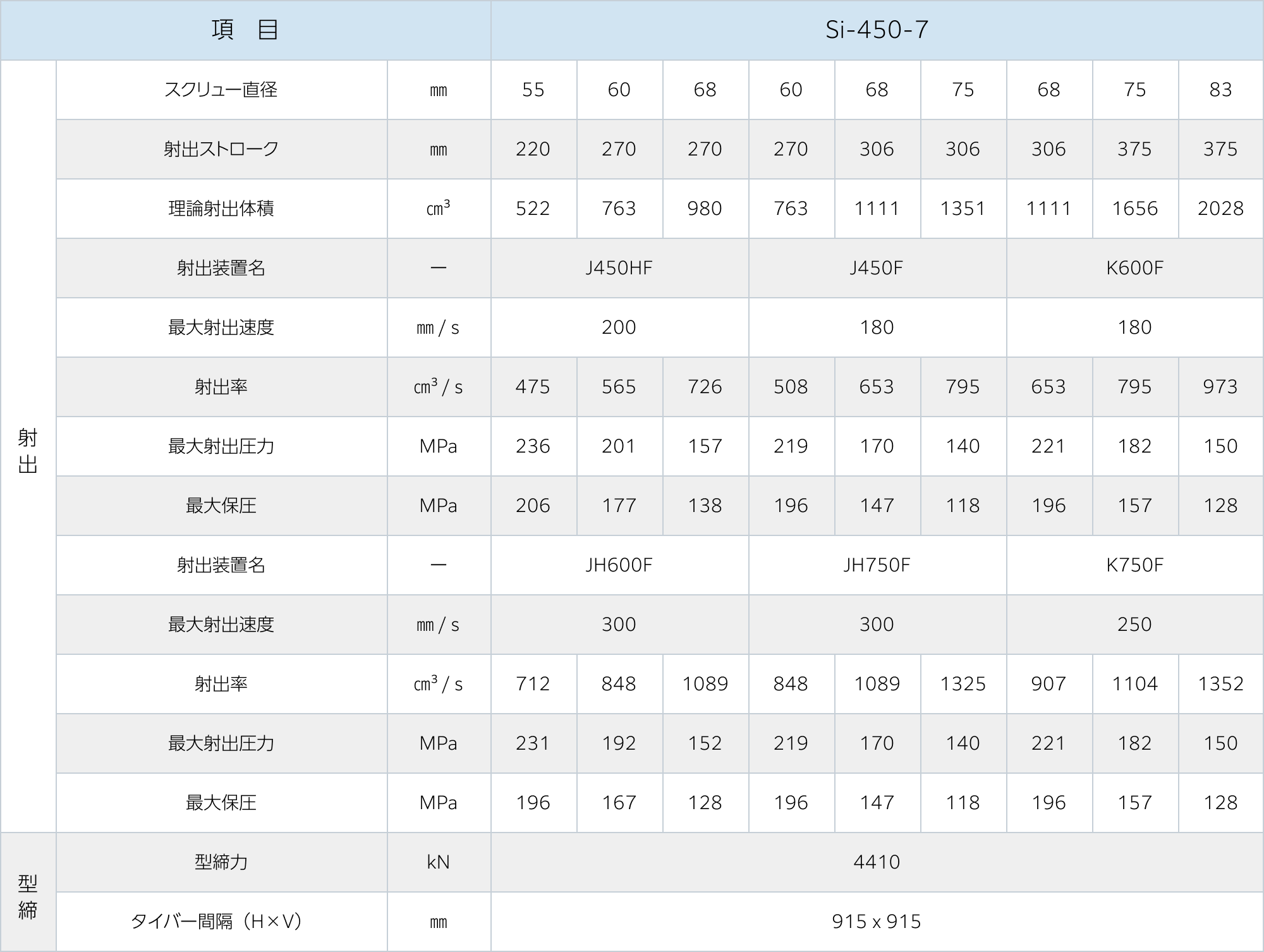 - 最大射出速度の数値は計算値です。射出圧力の設定値によって制限される場合があります。